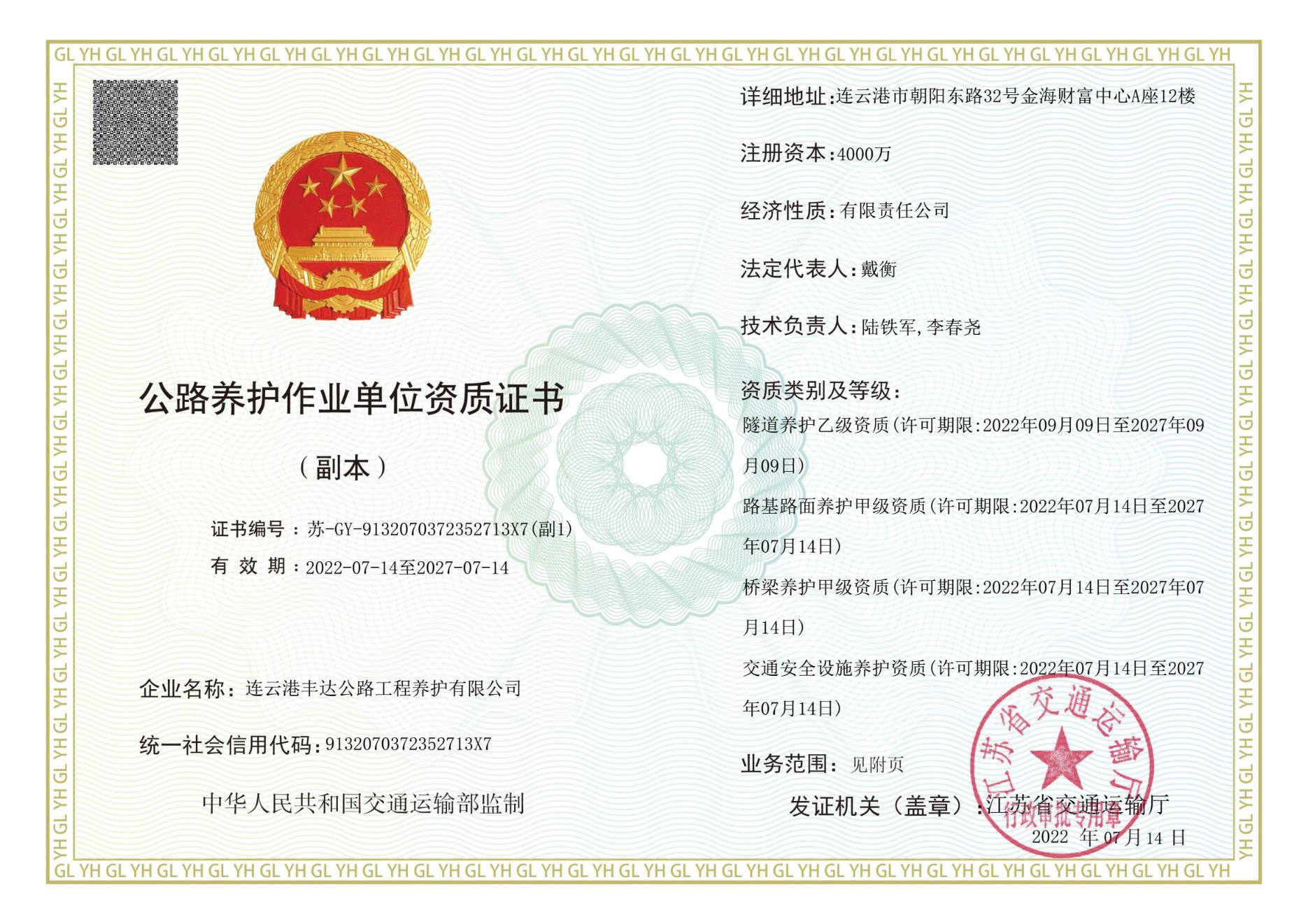 目前,豐達公司已獲得隧道乙級、路基路面養護甲級、橋梁養護甲級、交安設施養護四項資質(zhì),實(shí)現了養護業(yè)務(wù)范圍的不斷拓展和延伸。下一步公司將持續發(fā)力,不斷優(yōu)化資質(zhì)體系,提高養護作業(yè)能力和水平,為企業(yè)長(cháng)遠發(fā)展打下堅實(shí)基礎。
