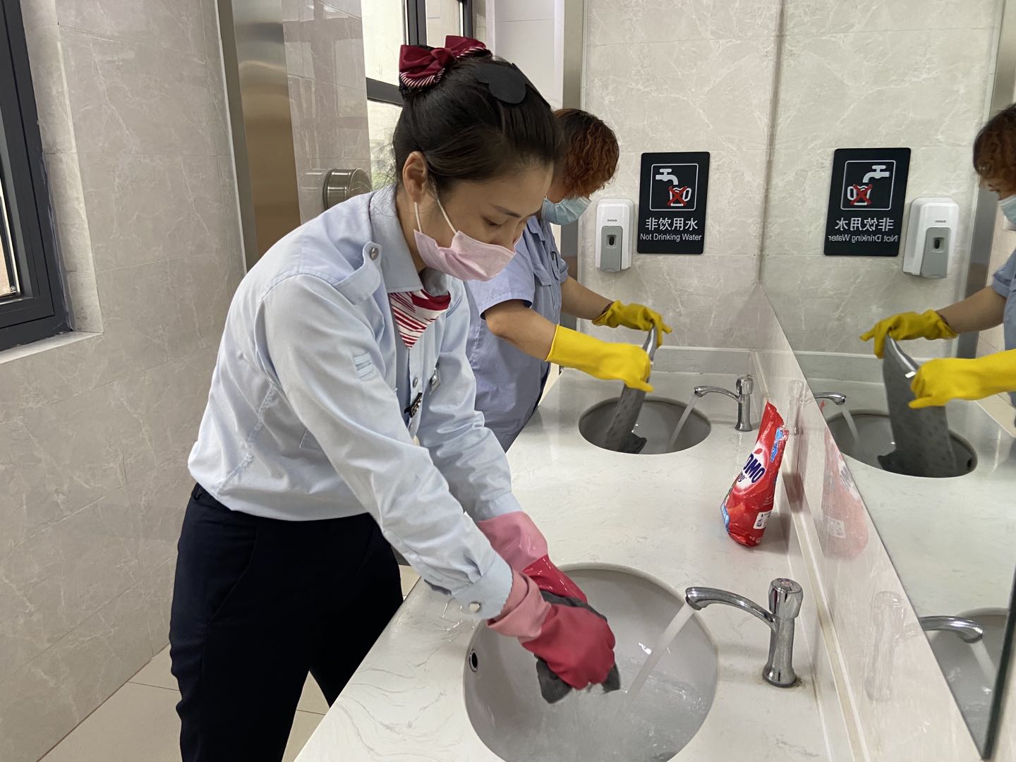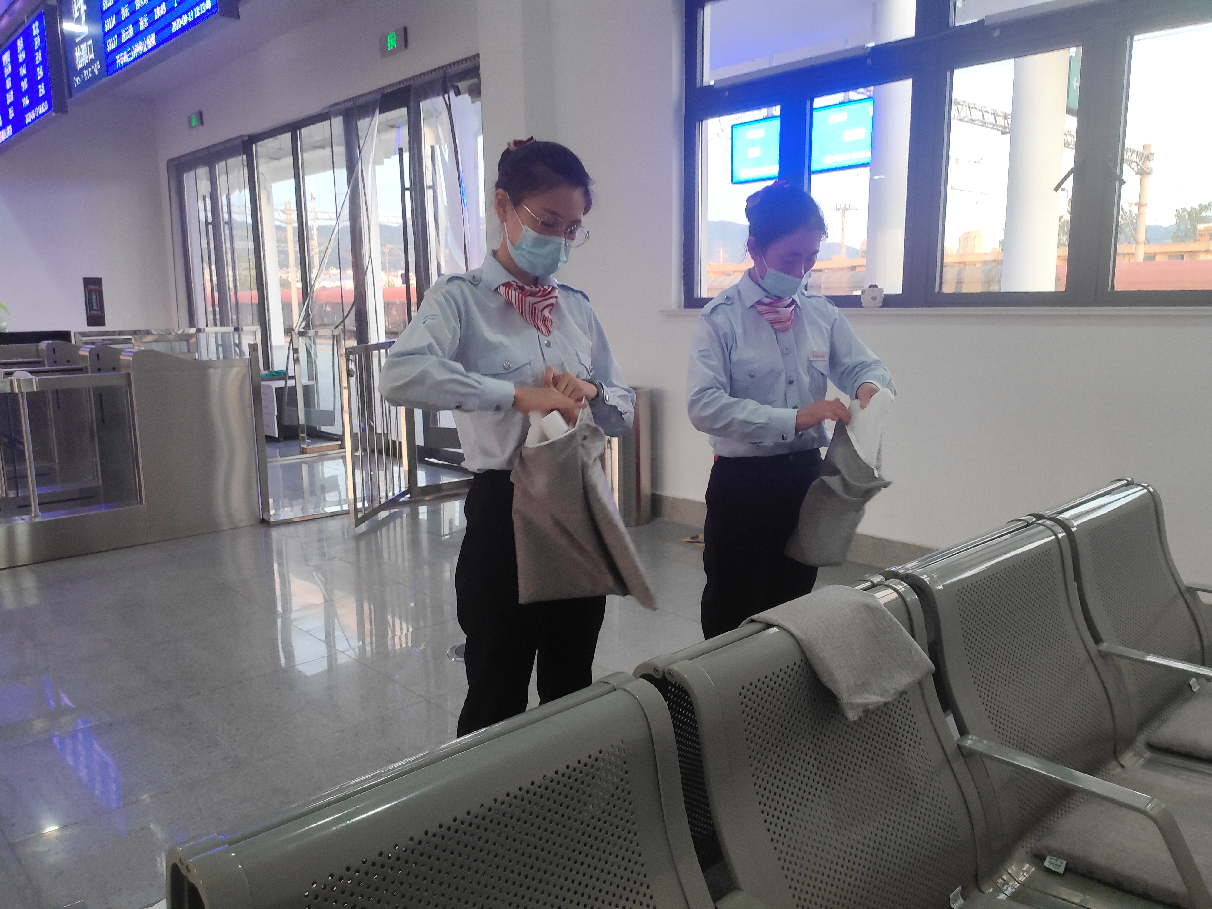 疫情當前,城市動(dòng)車(chē)站作為人口流動(dòng)和聚集較多的地點(diǎn)對疫情防控更是一刻不敢松懈。為每一位乘客做測溫登記,檢查健康碼,定時(shí)對候車(chē)廳打掃消毒,城市動(dòng)車(chē)組把疫情防控落到實(shí)處。為了乘客多一分安心與踏實(shí),城市動(dòng)車(chē)的保潔和站務(wù)員們配合一起對候車(chē)廳座椅上座墊進(jìn)行了清洗,站務(wù)組的姑娘們帶好手套,對每一個(gè)座墊仔細清洗消毒。連云站站長(cháng)孫曉婷在面對乘客問(wèn)詢(xún)時(shí),她說(shuō):“候車(chē)廳的座椅是乘客進(jìn)站后的第一歇腳處,座椅我們每天早晚都消毒一次,而坐墊與乘客直接接觸,我們更應該要定期清洗,既讓乘客感到潔凈舒適,也是我們對疫情防控貢獻自己的一份力量?!?/span>