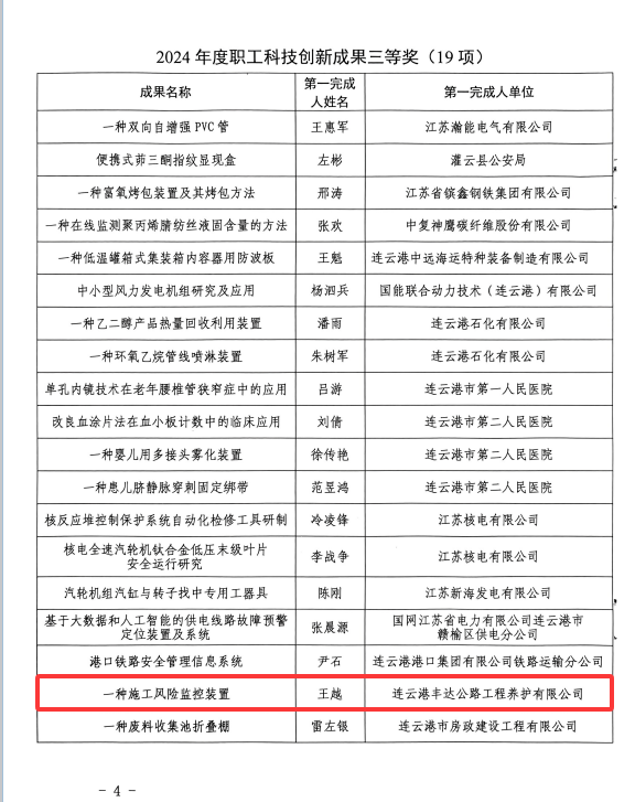 喜訊!豐達公司王越獲2024年度連云港市職工科技創(chuàng )新成果三等獎