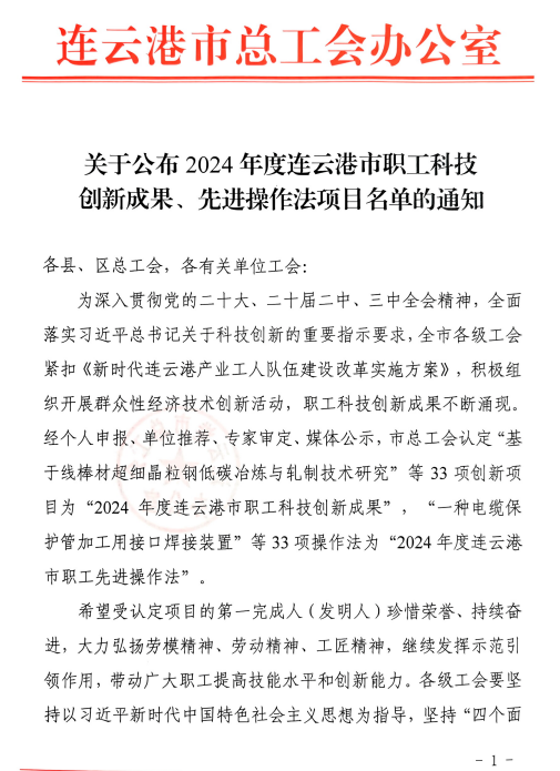近日,在2024年度連云港市職工科技創(chuàng )新成果、先進(jìn)操作法作品評選中,豐達公司王越申報的一項創(chuàng )新成果獲市職工科技創(chuàng )新成果三等獎。