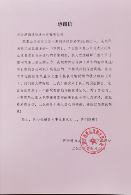 近日,花果山景區向市交通控股集團權屬公交集團送來(lái)了一封感謝信,感謝公交集團在五一期間高效的保障了游客的有序疏散。