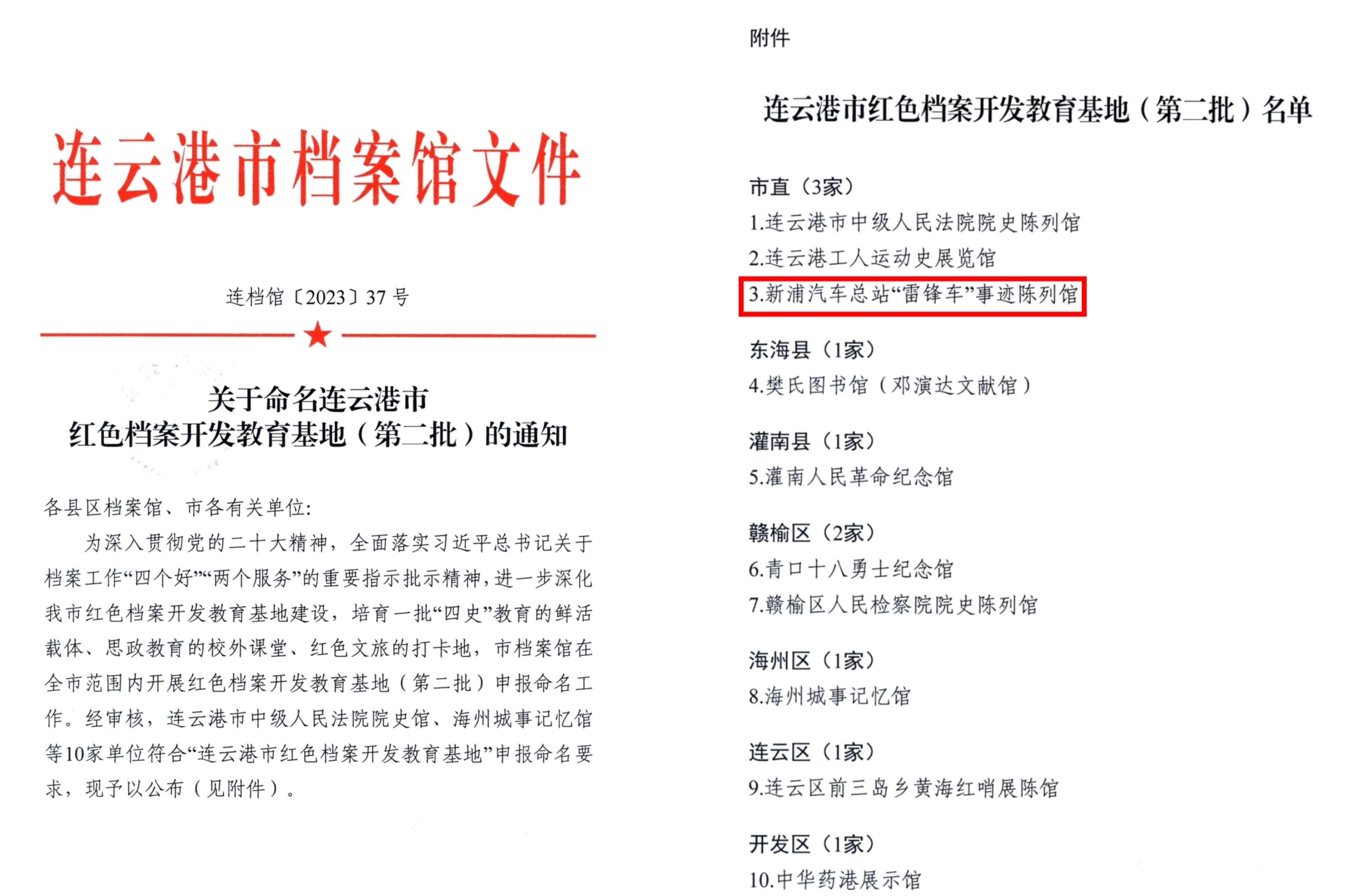 為進(jìn)一步深化連云港市紅色檔案開(kāi)發(fā)教育基地建設,培育一批“四史”教育的鮮活載體、思政教育的校外課堂、紅色文旅的打卡地,近日,連云港市檔案館在全市范圍內開(kāi)展紅色檔案開(kāi)發(fā)教育基地(第二批)申報命名工作,經(jīng)審核,“雷鋒車(chē)”事跡陳列館入選連云港市紅色檔案開(kāi)發(fā)教育基地(第二批)名單。