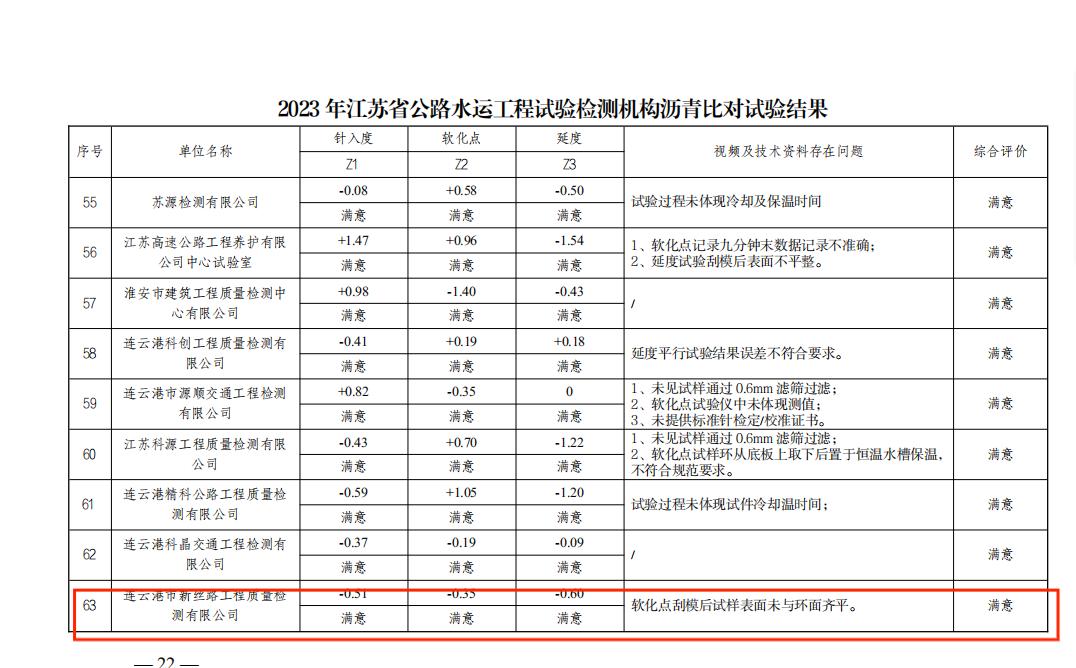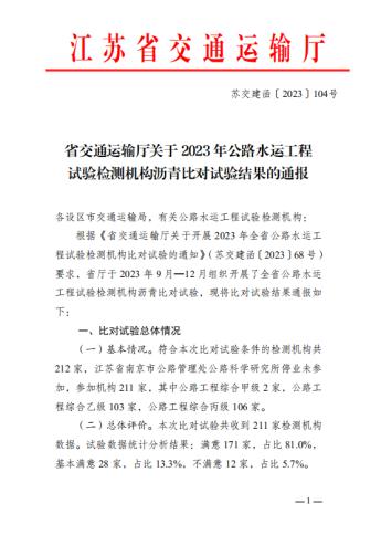 日前,江蘇省交通運輸廳組織開(kāi)展了全省公路水運工程試驗檢測機構瀝青比對試驗,江蘇海建新絲路檢測公司高度重視,認真參與。近日,根據蘇交建函〔2023〕104號發(fā)文通報,公司在此次比對試驗中結果為“滿(mǎn)意”。