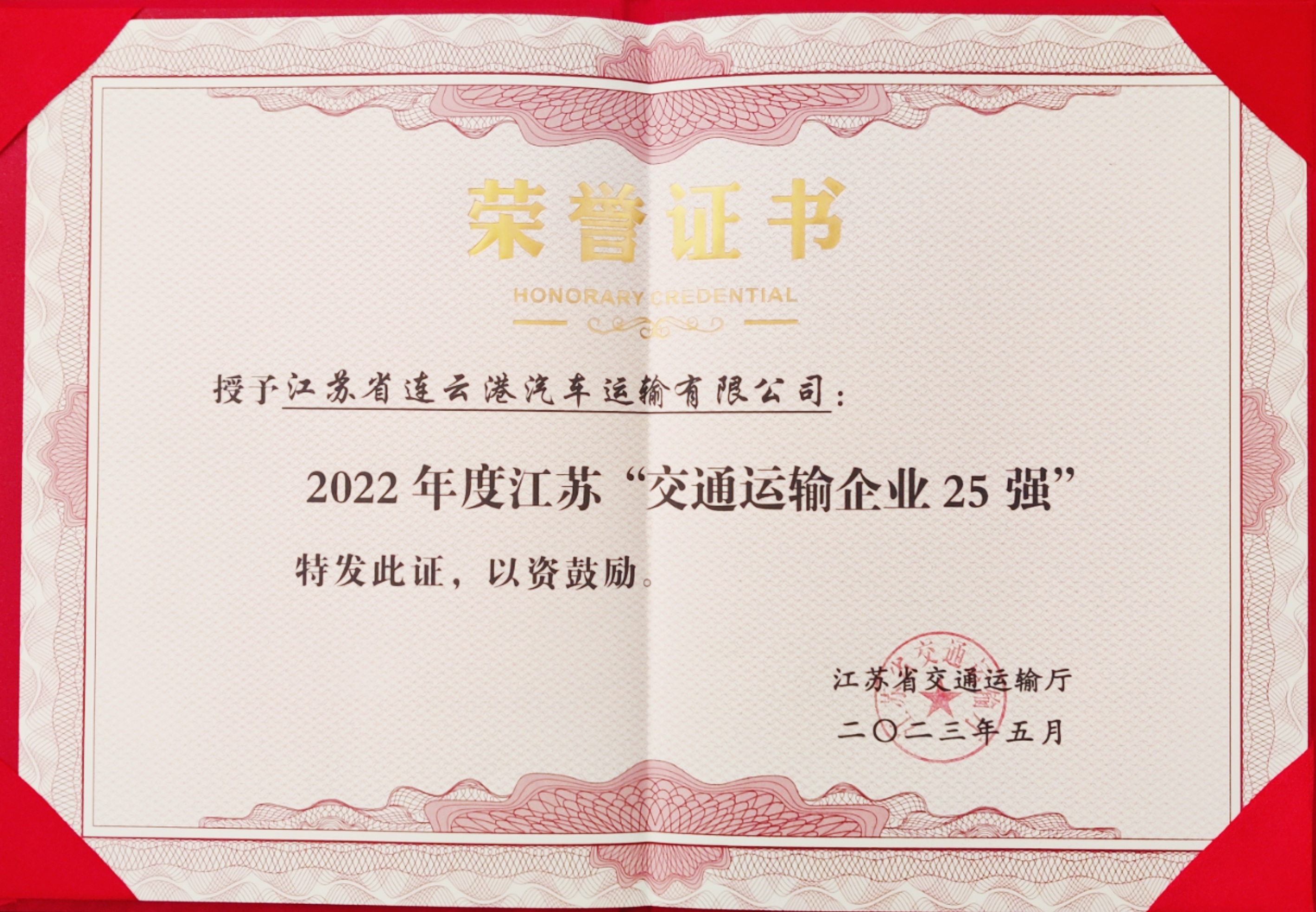 汽車(chē)公司榮獲2022年度江蘇“交通運輸企業(yè)25強”稱(chēng)號