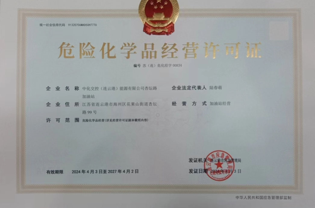 喜訊!中化交控能源有限公司杏壇路加油站危險化學(xué)品經(jīng)營(yíng)許可證順利獲批