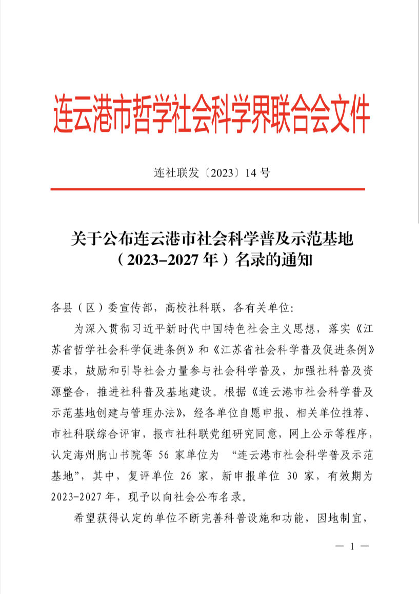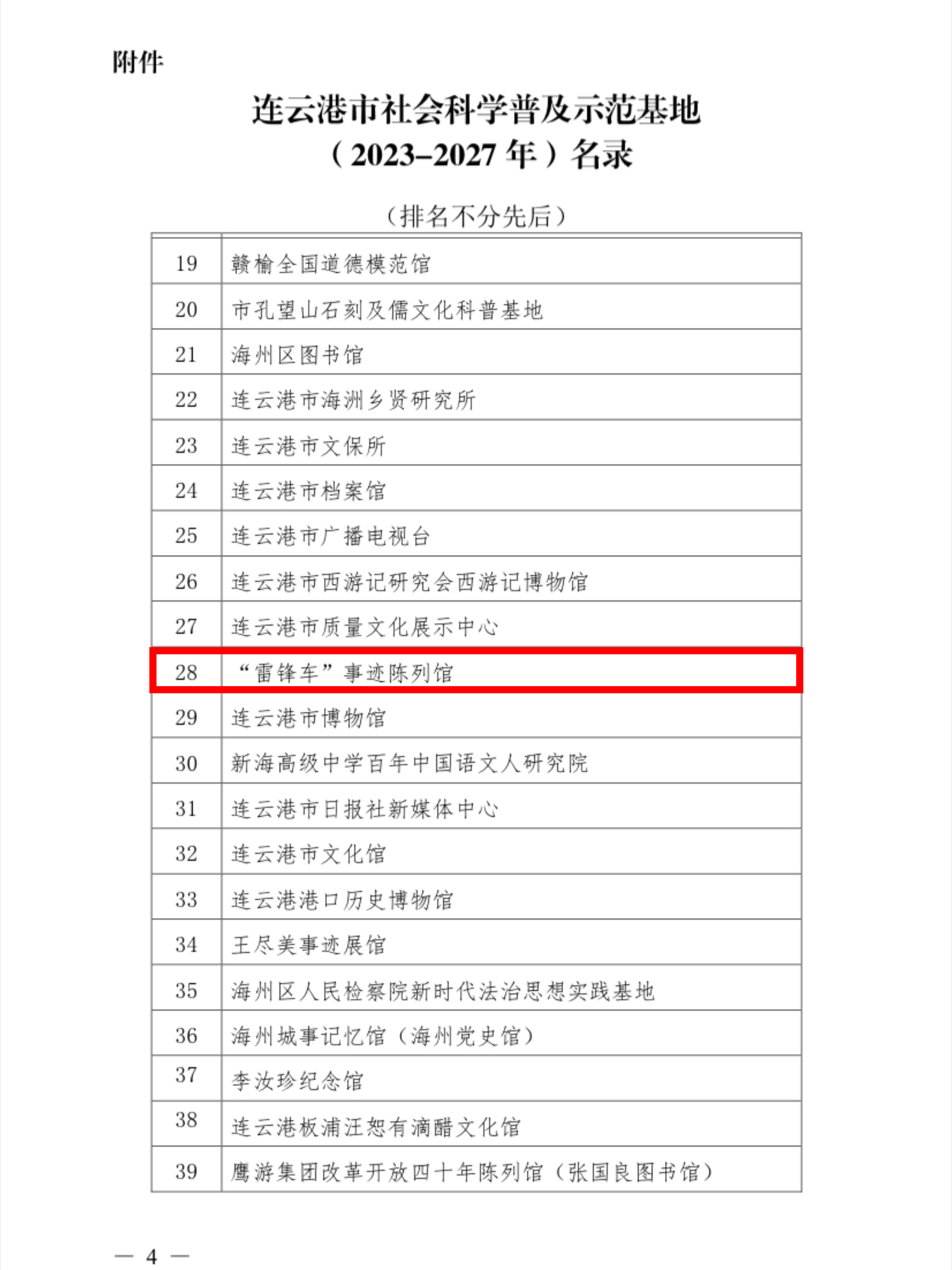 近日,連云港市哲學(xué)社會(huì )科學(xué)界聯(lián)合會(huì )公布連云港市社會(huì )科學(xué)普及示范基地 (2023-2027年)名錄,“雷鋒車(chē)”事跡陳列館榜上有名。
