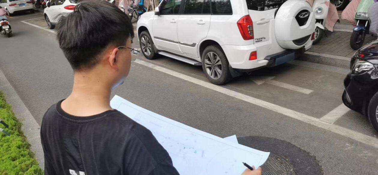 下午兩三點(diǎn)鐘,更是一天里最難耐的時(shí)候,空氣又熱又悶,楊明陽(yáng)顧不上被汗水浸濕的衣衫,頂著(zhù)烈日,在項目二期規劃范圍內多條道路進(jìn)行著(zhù)現場(chǎng)踏勘,找出適合停車(chē)建設的路段,匯總整理,直至太陽(yáng)落山才完成當天的勘察任務(wù)。