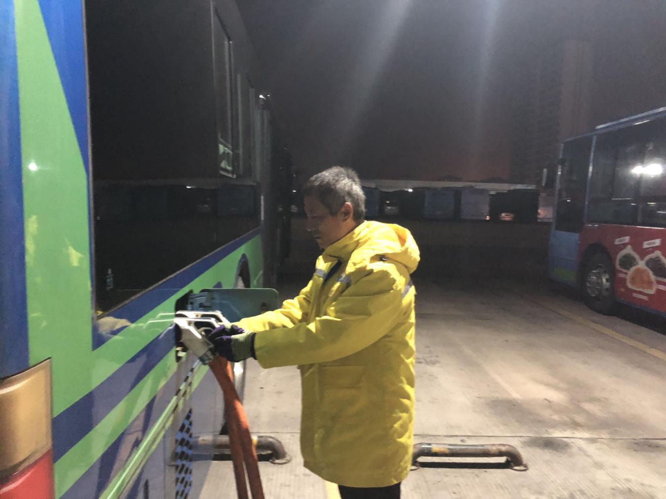 作為一個(gè)核心場(chǎng)站,西城充電站日均接待充電車(chē)輛近150余輛,充電量達10000度以上。深夜,董梁疏導公交車(chē)安全停放后,熟練地用右手食指按住卡簧拔出充電槍?zhuān)D身插入車(chē)輛的充電接口,只聽(tīng)“咔噠”一聲,充電樁液晶屏顯示一切正常,董梁再刷卡、登記,車(chē)輛正式開(kāi)始充電,整套動(dòng)作可謂一氣呵成。凌晨3時(shí),早班班次車(chē)輛都完成充電,他剛走進(jìn)休息室,倒了杯溫水一飲而盡后,未作停留又開(kāi)始巡檢充電樁,對充電站的消防設施、電氣線(xiàn)路等設備進(jìn)行檢查。