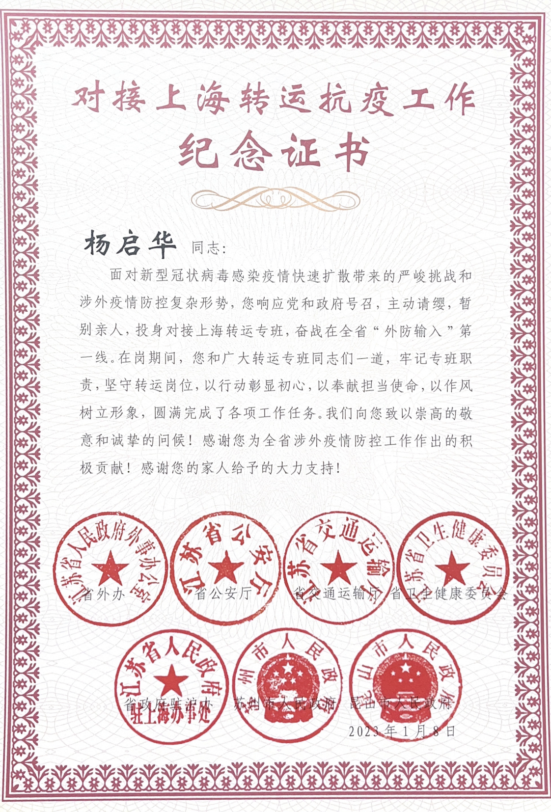近日,汽車(chē)公司收到由省外辦、省公安廳、省交通運輸廳、省衛生健康委員會(huì )、省政府駐瀘辦、蘇州市人民政府、昆山市人民政府共同頒發(fā)的44份對接上海轉運抗疫工作紀念證書(shū),向支援疫情防控工作的集體和個(gè)人表示了誠摯的謝意。