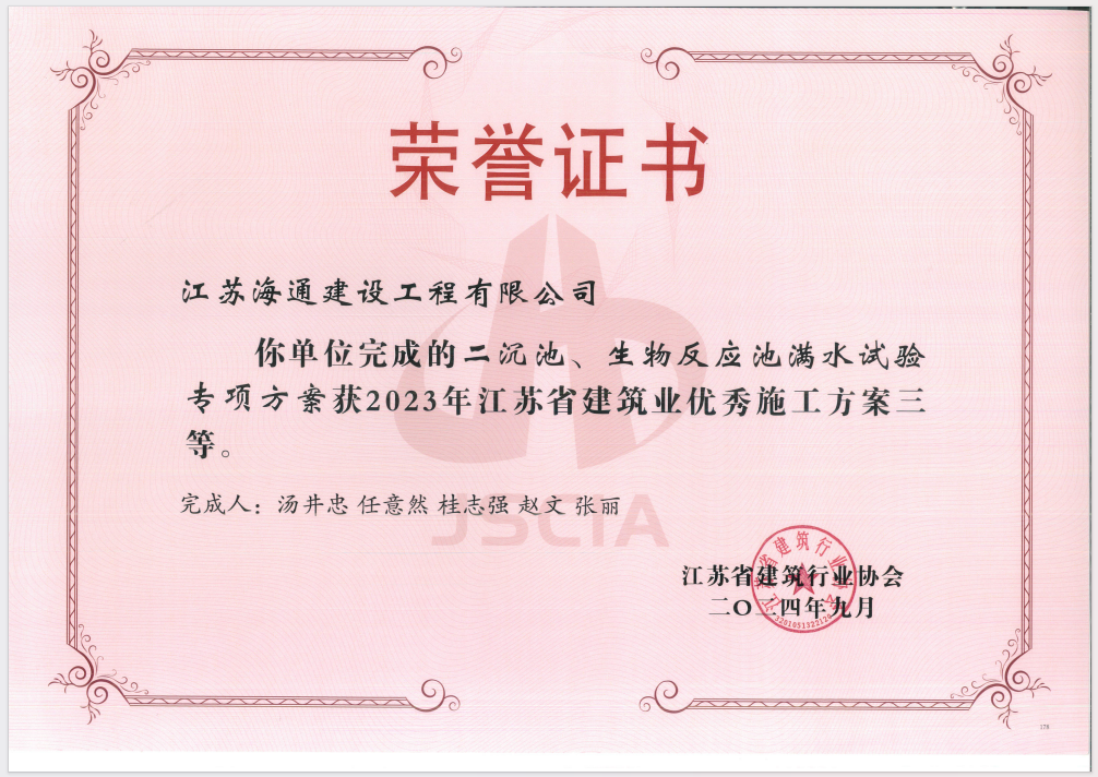近日,江蘇省建筑行業(yè)協(xié)會(huì )公布了2023年度江蘇省建筑業(yè)優(yōu)秀施工方案評價(jià)結果,海建公司申報的三項施工方案獲得榮譽(yù),其中《預制箱梁運輸安裝專(zhuān)項方案》獲得江蘇省建筑業(yè)優(yōu)秀施工方案二等,《嵌巖方樁專(zhuān)項施工方案》、《二沉池、生物反應池滿(mǎn)水試驗專(zhuān)項方案》獲得江蘇省建筑業(yè)優(yōu)秀施工方案三等。