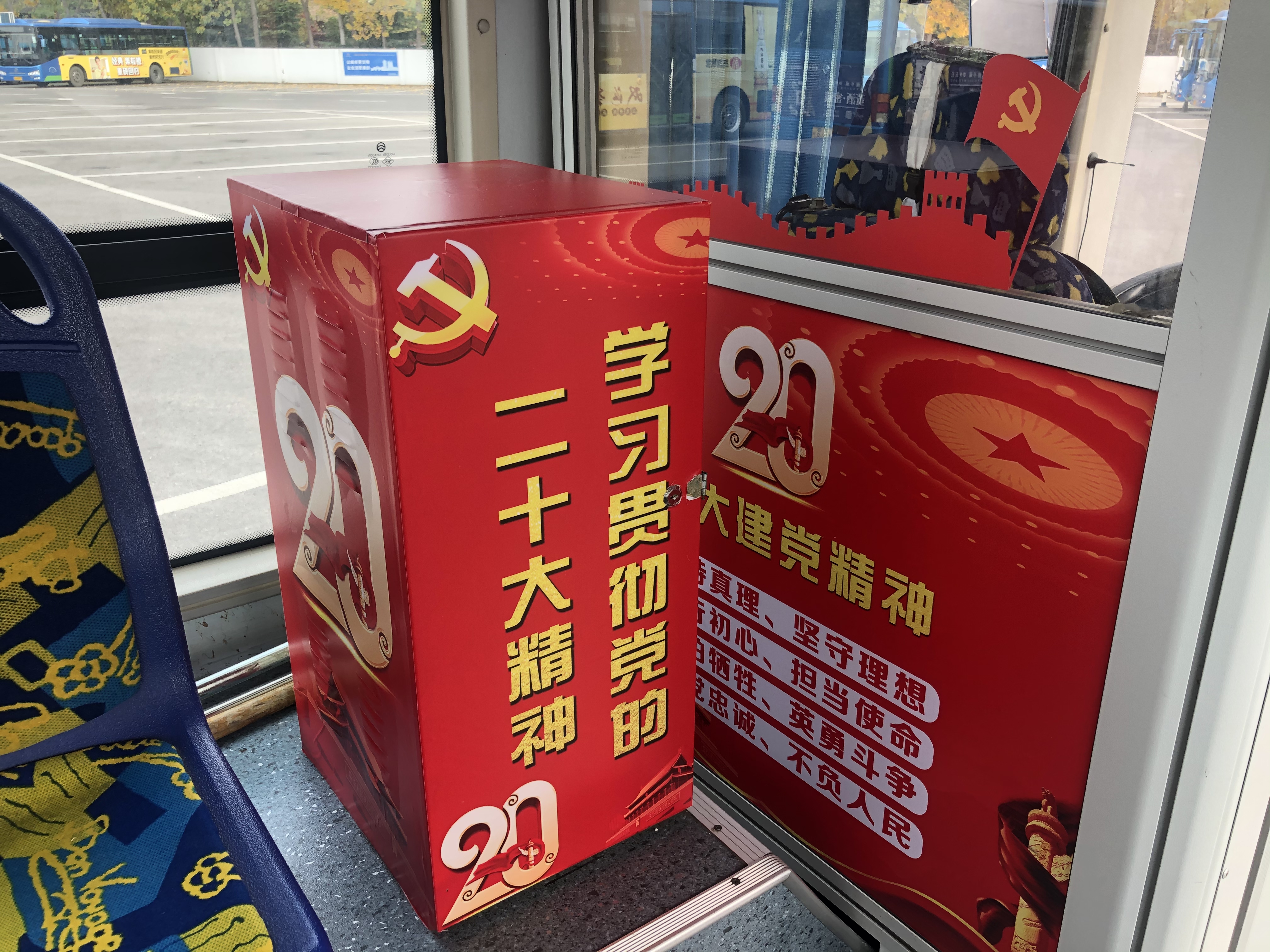 在暨2021年建黨百年“紅色黨史”主題車(chē)廂的基礎上,今年公交事業(yè)一部黨支部緊緊圍繞黨的二十大為宣傳主線(xiàn),充分結合當前工作實(shí)際,在持續深化黨史學(xué)習教育的同時(shí),以公交20路為紅色宣傳載體再發(fā)力,分別將車(chē)身廣告及車(chē)內展板進(jìn)行更新升級,以黨的二十大報告為主要宣傳內容,打造了主題會(huì )議型車(chē)廂。