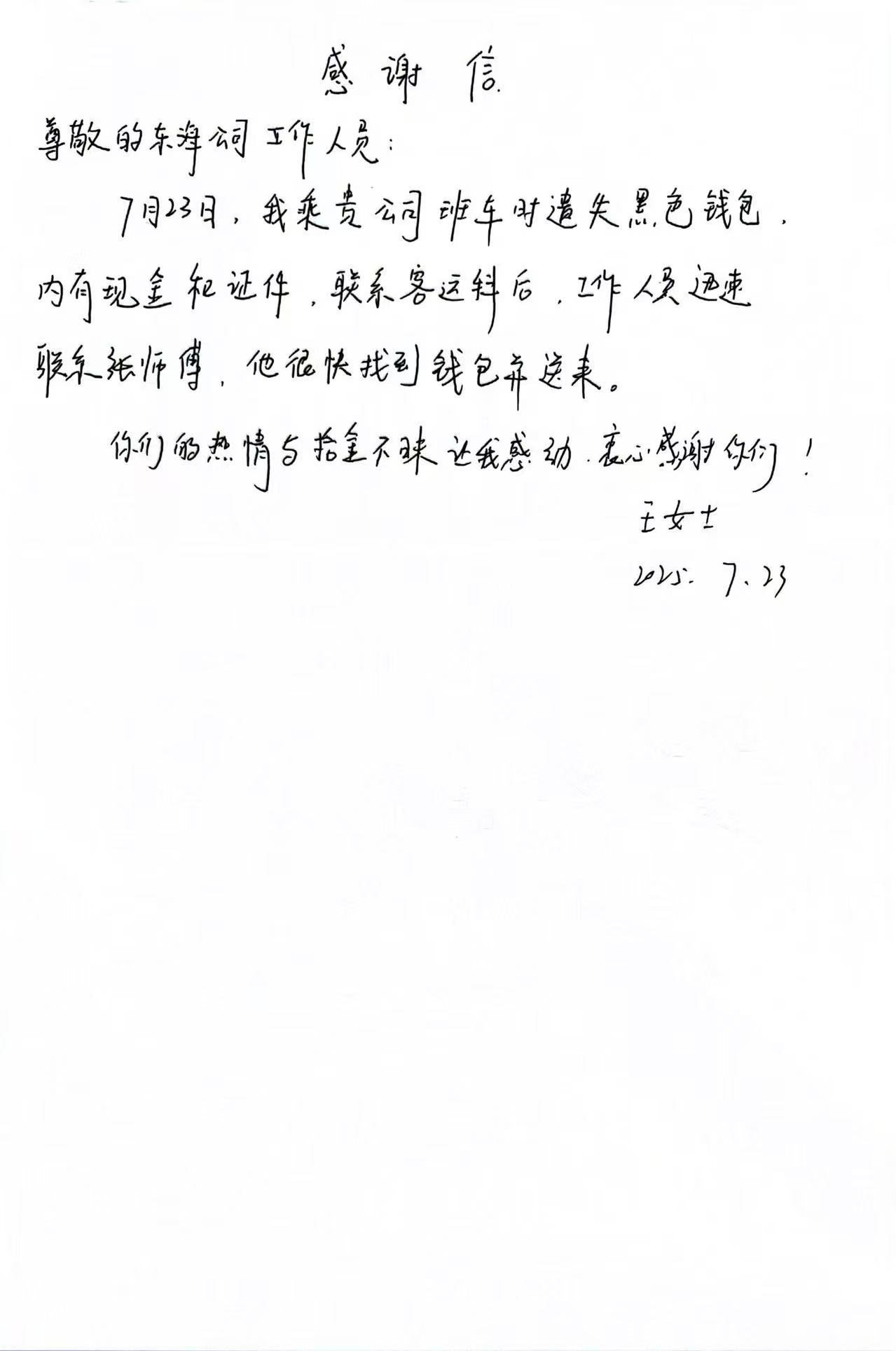 事后,王女士特意寫(xiě)下感謝信,感慨錢(qián)包里面的現金、證件一樣沒(méi)少,再三感謝張師傅及工作人員。張師傅拾金不昧的行為,不僅展現了他個(gè)人高尚的道德品質(zhì),也彰顯了我公司員工良好的職業(yè)素養,溫暖了乘客的心。