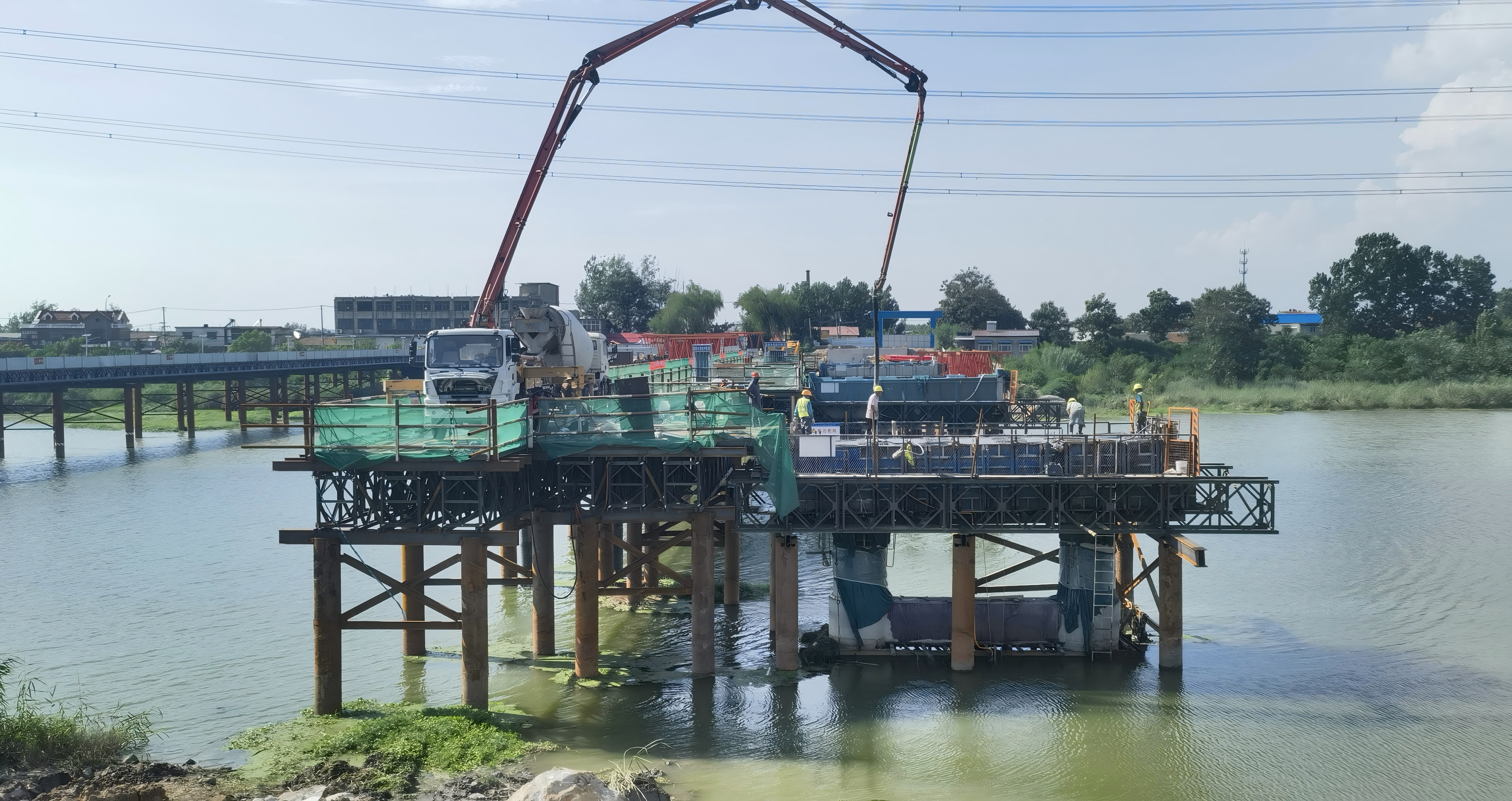 該五跨橋梁全長(cháng)210米,橫跨薔薇河,是作為薔薇河上的重要通道、老海州城區對外出行通道的重要交通樞紐。為確保水上蓋梁施工的安全與精度,項目部科學(xué)組織、精益管理,克服深水作業(yè)、汛期影響、通航壓力等多重挑戰。全體建設者發(fā)揚連續作戰的精神,搶抓枯水期等有利時(shí)機,晝夜輪班,最終安全、優(yōu)質(zhì)、高效地完成全部水上蓋梁的澆筑任務(wù),各項技術(shù)指標均符合設計規范要求。現場(chǎng)項目負責人周宇寬表示:“水上蓋梁的全部完工,意味著(zhù)大橋的‘水中骨架’已經(jīng)牢牢筑就。接下來(lái),項目部將全力以赴轉入T梁架設及橋面系施工階段,我們有信心按期實(shí)現全橋合攏的目標?!?/span>