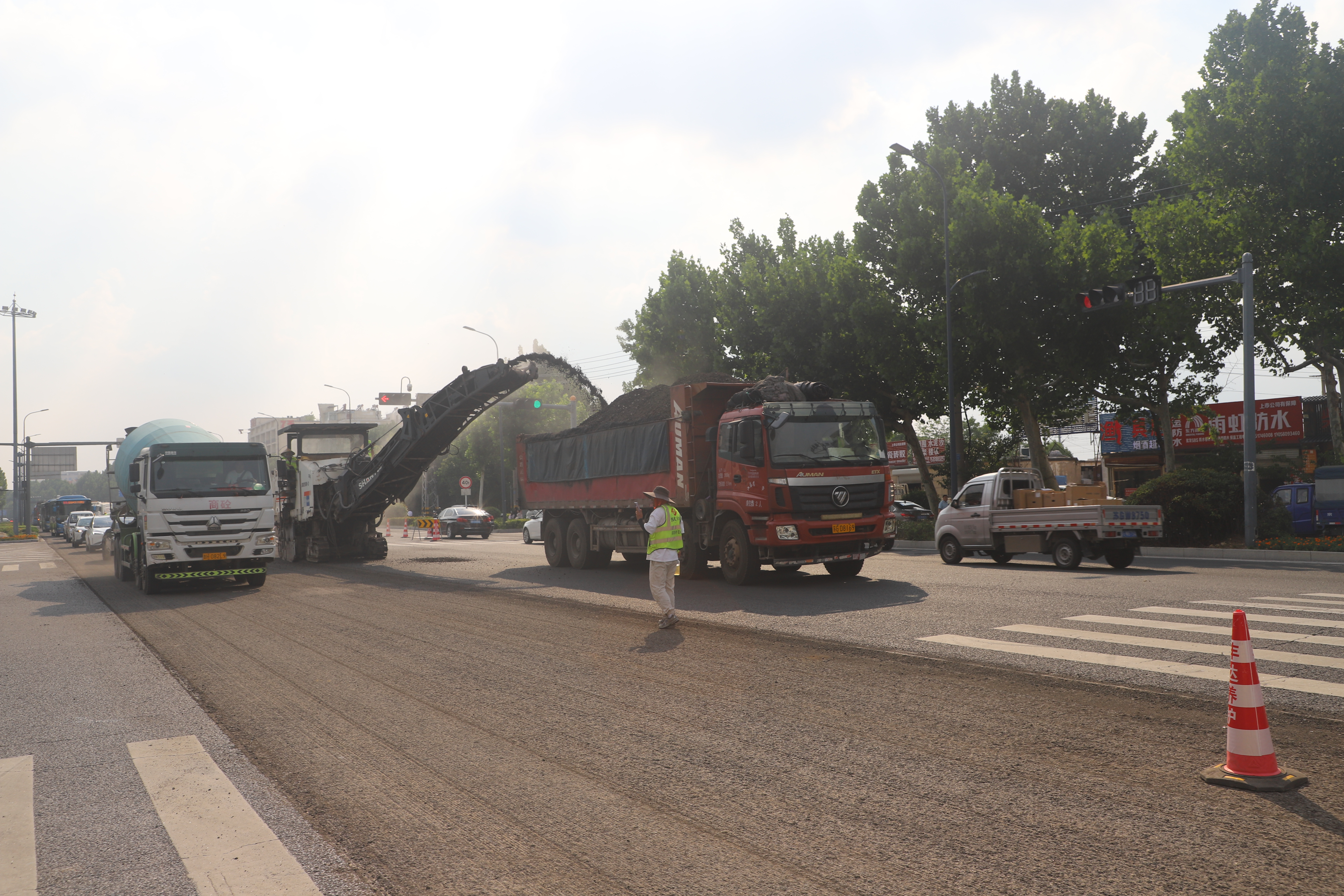 人民路外圍車(chē)流量大,重型車(chē)輛較多,路面沉降、龜裂、車(chē)轍等病害較為嚴重,行車(chē)舒適性較差,且不能全封閉施工。為加快施工進(jìn)度,避免高峰路段擁堵,項目部人員不畏高溫酷暑,攻堅克難,采取降塵除塵、分段施工、基坑防護等多項措施錯峰施工,克服噪音擾民等諸多困難,做好全線(xiàn)文明施工工作,共投入機械設備18余臺次,人員30余人,歷經(jīng)八晝夜的加緊施工,共修補攤鋪路面56336.7平方米。