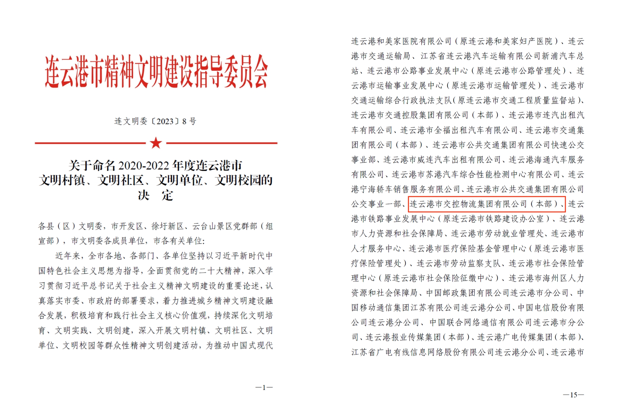 經(jīng)申報、網(wǎng)上審核、現場(chǎng)審查等一系列流程,物流集團順利通過(guò)了2020-2022年度連云港市文明單位測評,并于12月27日收到由連云港市精神文明建設指導委員會(huì )印發(fā)的《連文明委〔2023〕8號《關(guān)于命名2020-2022年度連云港市文明單位的決定》》文件。