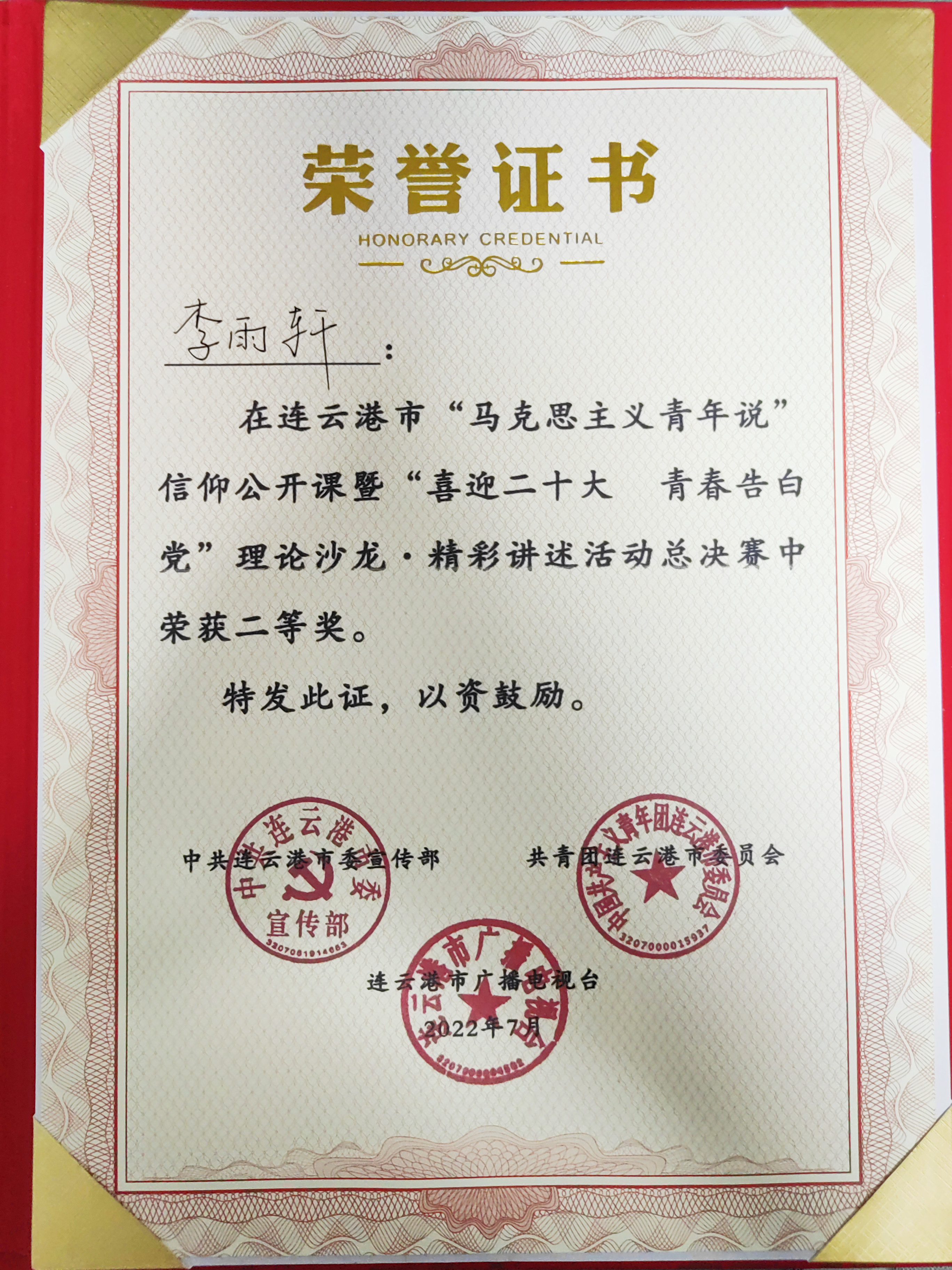為深入學(xué)習宣傳貫徹習近平新時(shí)代中國特色社會(huì )主義思想和黨的十九屆會(huì )議系列精神,不斷推進(jìn)馬克思主義中國化、時(shí)代化、大眾化,以實(shí)際行動(dòng)迎接黨的二十大勝利召開(kāi),7月27日,由市委宣傳部、團市委、市廣播電臺聯(lián)合舉辦的全市“馬克思主義青年說(shuō)”信仰公開(kāi)課暨“喜迎二十大 青春告白黨”理論沙龍?精彩講述活動(dòng)總決賽在市廣播電臺舉行。連汽新浦汽車(chē)站總站“雷鋒車(chē)”手李雨軒在此次比賽中榮獲二等獎。