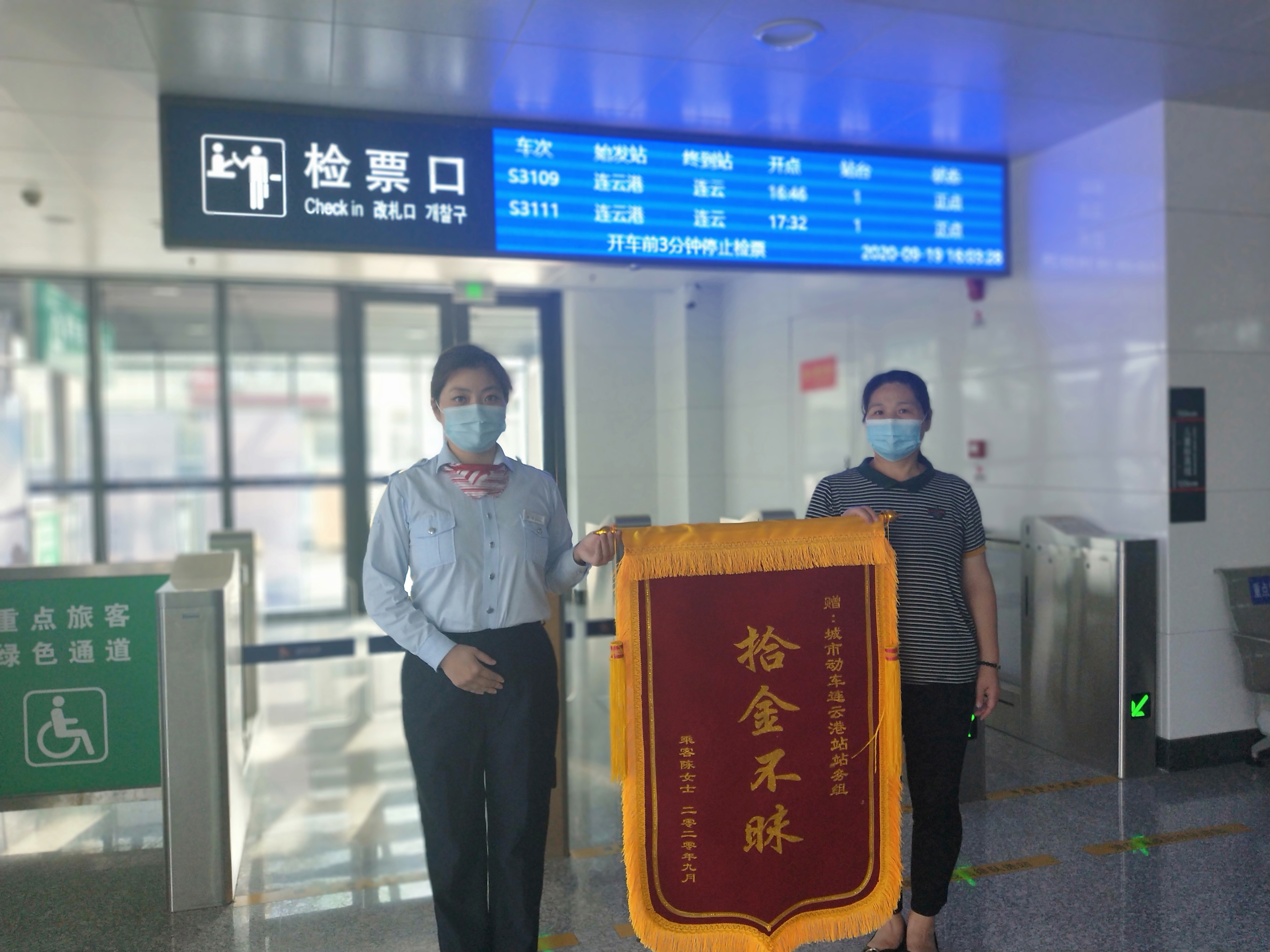 站務(wù)員韓雪了解情況后,這位旅客乘坐的車(chē)次已經(jīng)開(kāi)走,所以她連忙打電話(huà)到鹽坨站讓站務(wù)員上車(chē)尋找。站務(wù)員張送亞每一個(gè)角落都不放過(guò),終于在一個(gè)座位上找到了包。韓雪立刻將這個(gè)好消息告訴這位失主陳女士。陳女士當時(shí)激動(dòng)不已。當天下午,陳女士送來(lái)了錦旗表示感謝,激動(dòng)地握著(zhù)韓雪的手說(shuō):“太感謝你們了,包里現金雖然不多,但是如果銀行卡和醫??▉G失,那可就麻煩了。你們城市動(dòng)車(chē)工作人員的工作態(tài)度真的讓我非常感動(dòng)?!?/span>