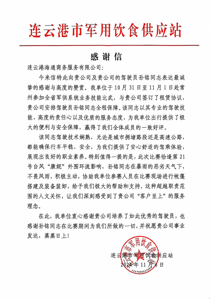近日,汽服公司權屬汽車(chē)租賃事業(yè)部收到了一封來(lái)自連云港市軍用飲食供應站的感謝信,信中表達了對租賃事業(yè)部政務(wù)保障車(chē)駕駛員孫銘的感謝與肯定。紙短情長(cháng),一封感謝信承載了客戶(hù)對駕駛員的信任與感激,也傳遞了汽服公司“客戶(hù)至上”的服務(wù)理念。