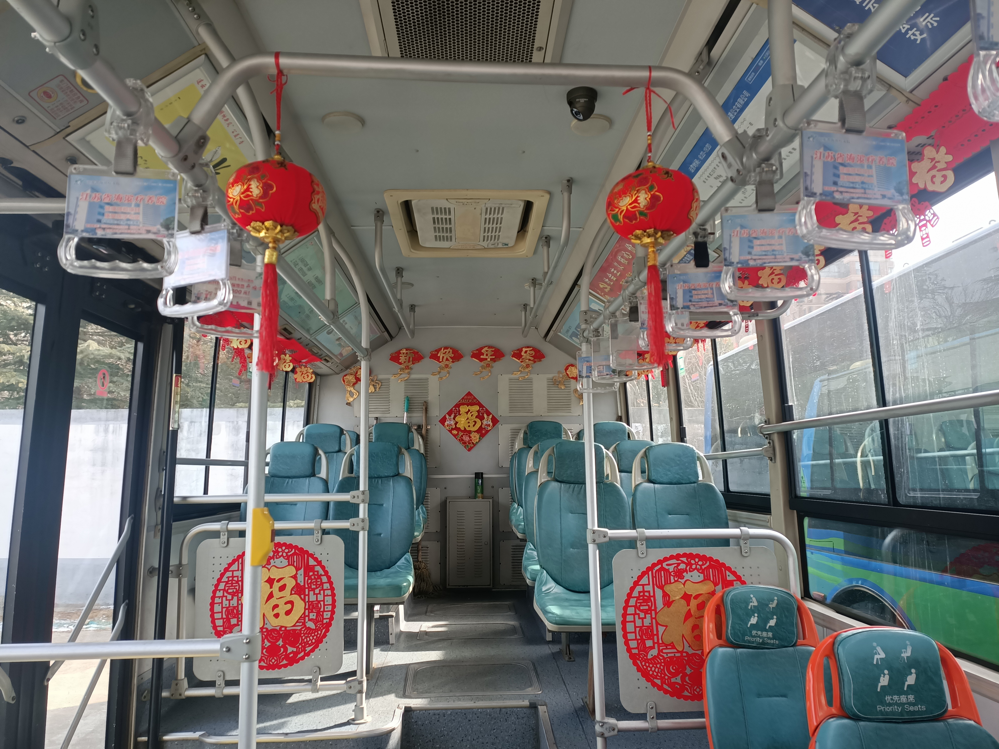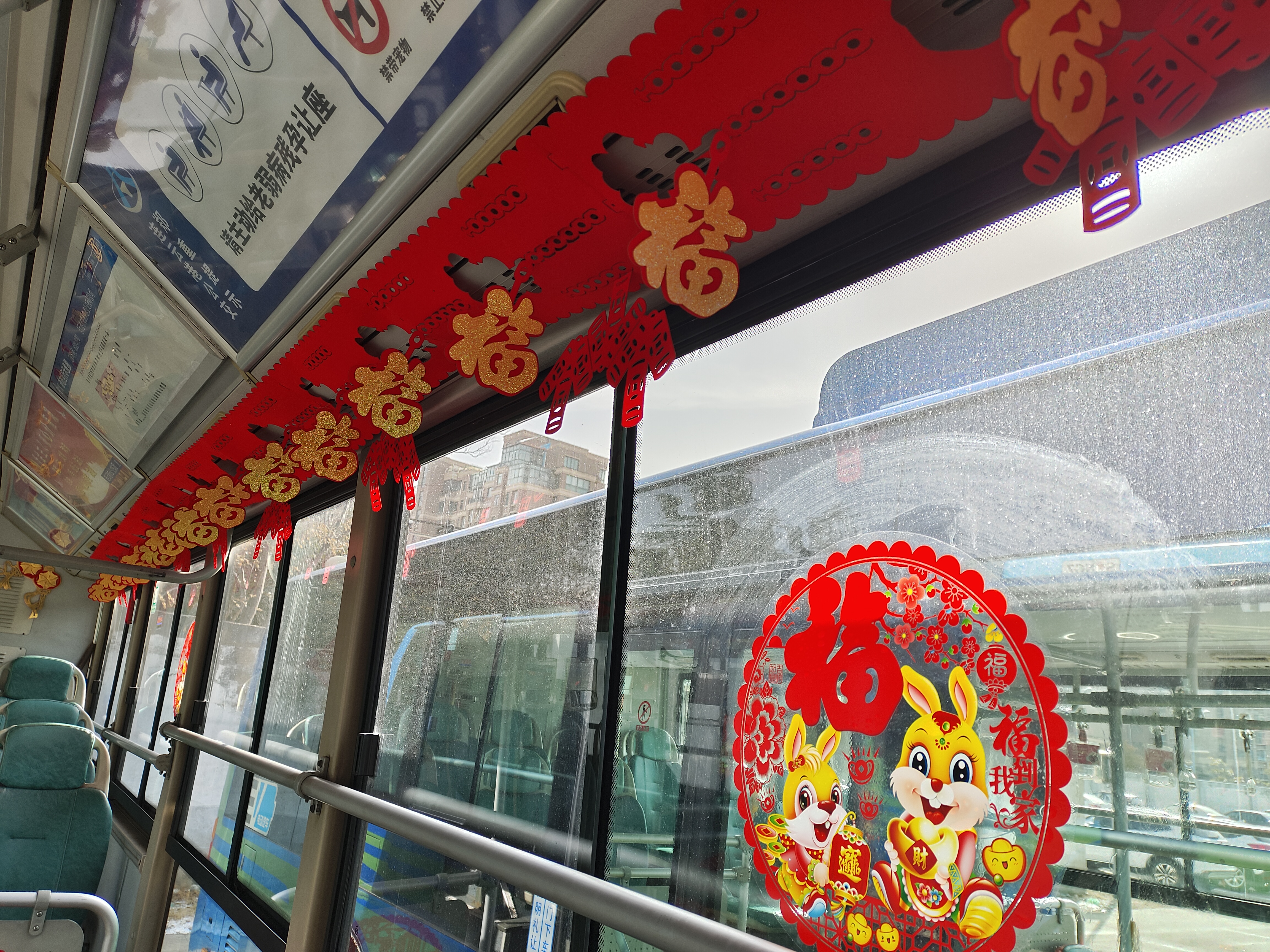 走進(jìn)新春主題車(chē)廂,只見(jiàn)車(chē)廂內紅火一片,充滿(mǎn)了“中國紅”的喜慶色彩。車(chē)廂頂部兩邊懸掛著(zhù)的紅色拉花配上金色的“?!弊?,顯得格外喜慶耀眼,金燦燦的“?!弊?,預示著(zhù)生活幸福、體健安康。車(chē)廂尾部張貼的紅色兔年“新年快樂(lè )”的裝飾和車(chē)窗上張貼的可愛(ài)俏皮的紅色卡通兔子窗花,配上“兔年吉祥”“大吉大利”等吉祥話(huà)語(yǔ),烘托出了滿(mǎn)滿(mǎn)的節日吉祥氛圍,使得車(chē)廂內洋溢著(zhù)一片新年氣息,年味十足,讓乘車(chē)的乘客步入車(chē)廂就能感受到濃濃的新年喜慶氛圍,公交集團快速公交事業(yè)部希望通過(guò)這種獨特的方式向乘客傳遞出新年的祝福。