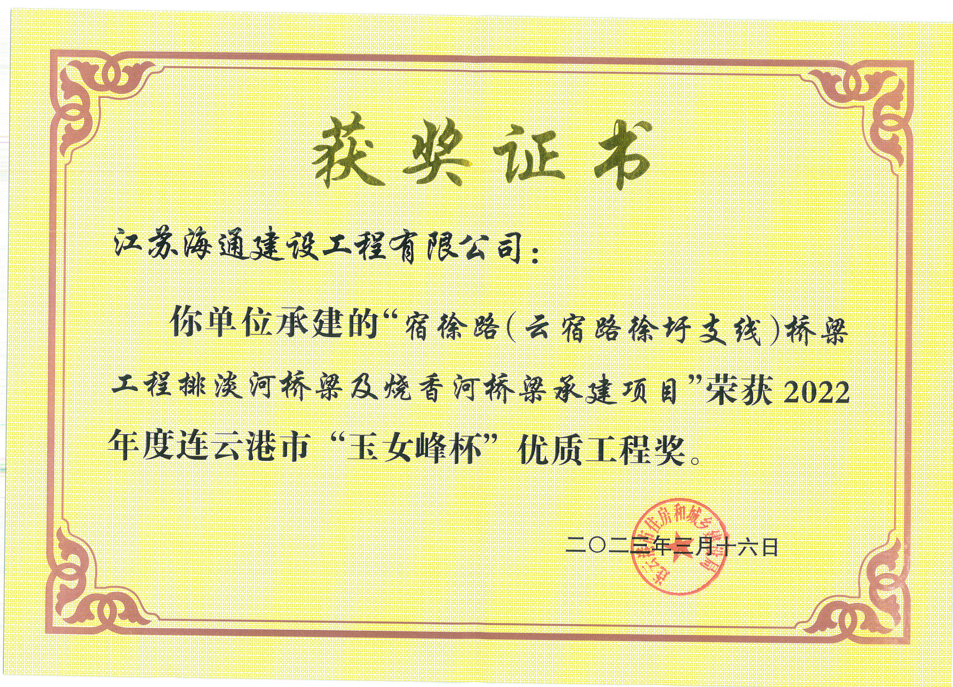 近日,從連云港市住房和城鄉建設局獲悉,由江蘇海建公司承建的337省道灌南段路面改造工程、連云港新機場(chǎng)集疏運道路(長(cháng)深高速新機場(chǎng)互通連接線(xiàn))工程項目、宿徐路(云宿路徐圩支線(xiàn))橋梁工程排淡河橋梁及燒香河橋梁施工項目”三個(gè)項目榮獲2022年度連云港市“玉女峰杯”優(yōu)質(zhì)工程獎。