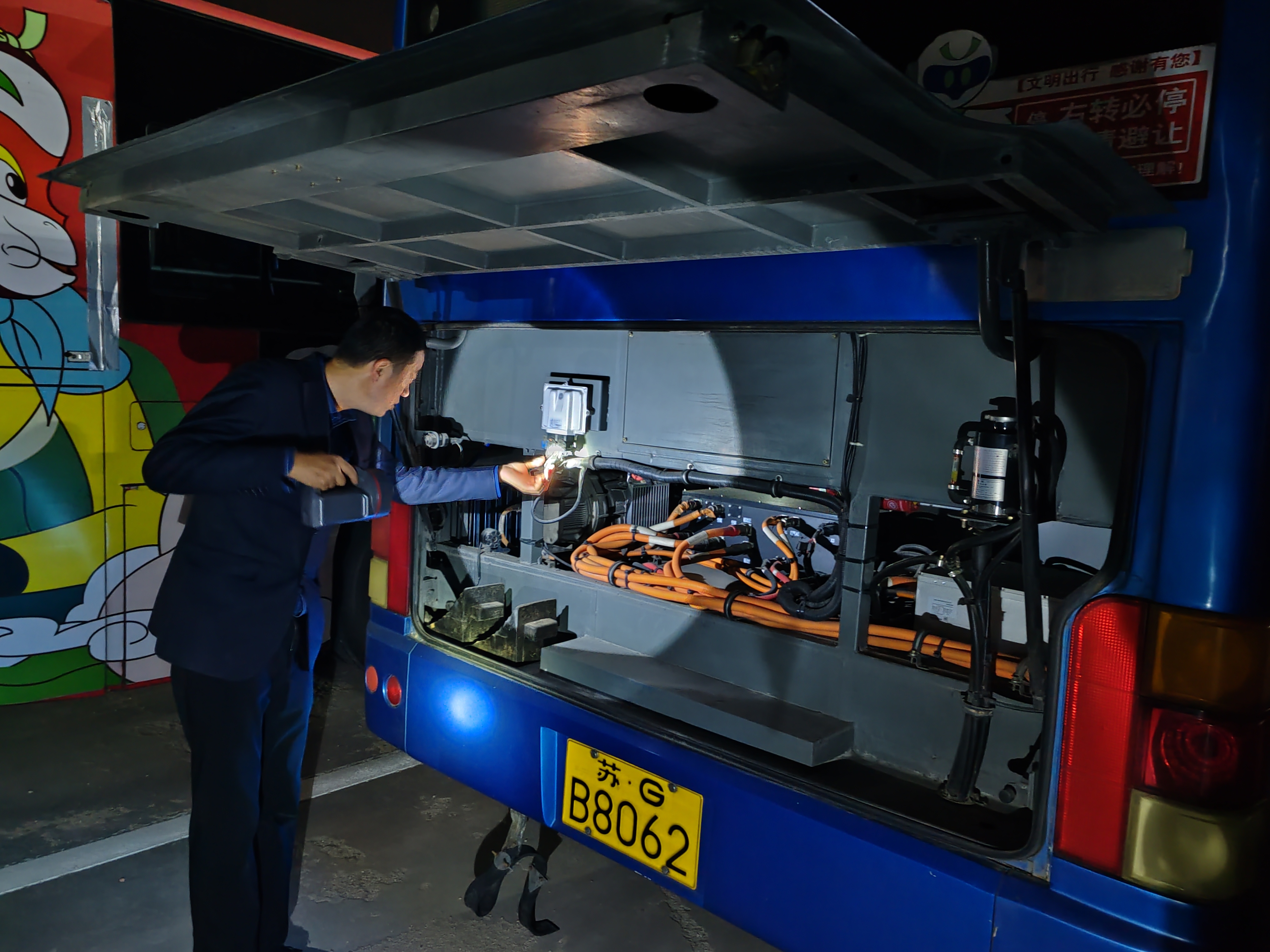 照耀夜色的燈光劃破深夜的寂靜,公交集團權屬海通公交公司管理人員正在對場(chǎng)站內的公交車(chē)進(jìn)行車(chē)況和消防器材檢查。手電筒的光束在車(chē)輛上來(lái)回掃過(guò),秋風(fēng)中檢查人員的身影顯得格外堅定。每一項零部件都被仔細地查驗,滅火器壓力是否正常使用、逃生錘是否配備齊全,都牽動(dòng)著(zhù)他們的心弦。大家深知,公交車(chē)承載的不僅是歸家的乘客,更是無(wú)數家庭的期盼與安寧。