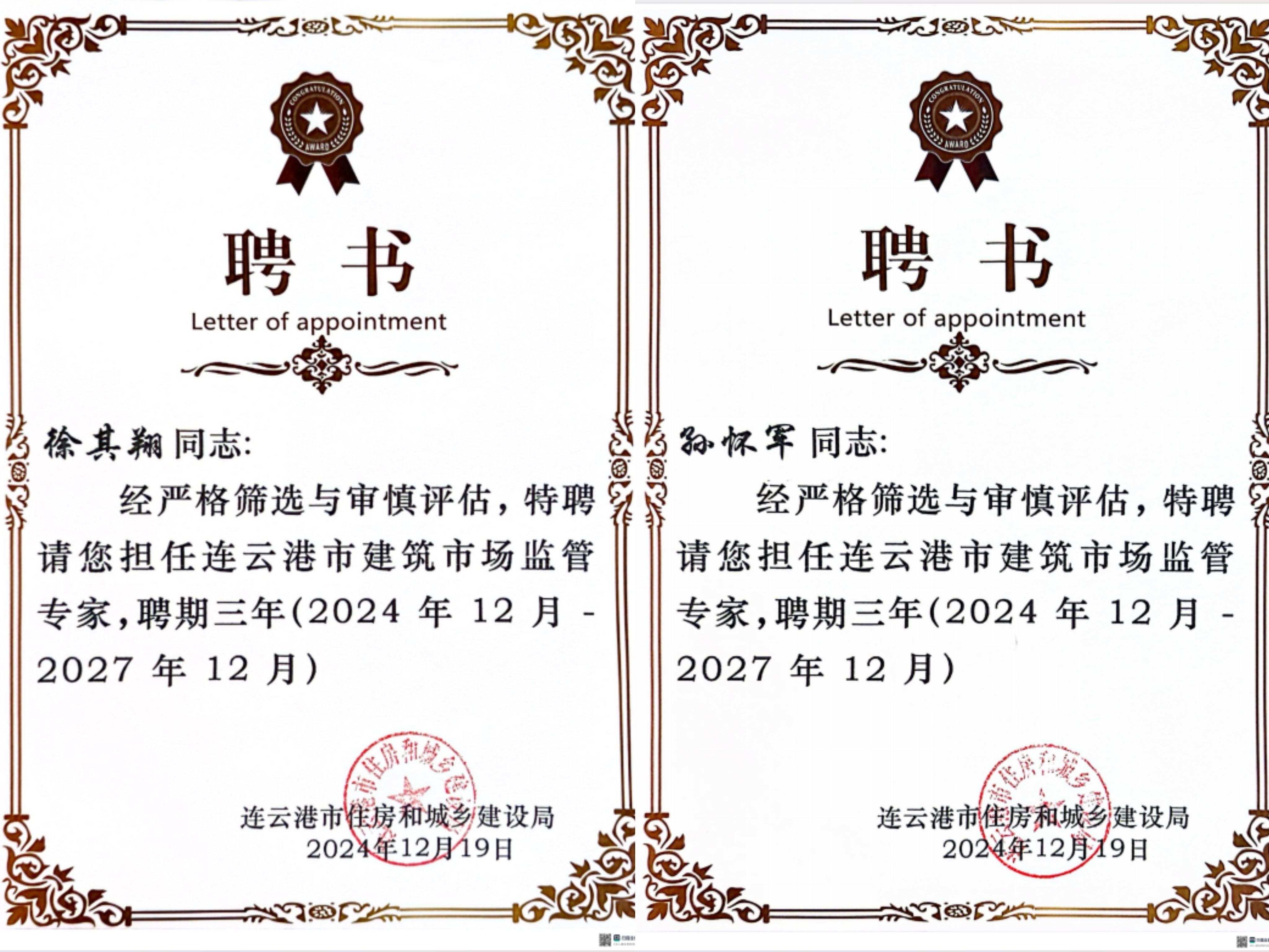 近日,市住建局組織召開(kāi)連云港市建筑行業(yè)委員會(huì )成立暨行業(yè)專(zhuān)家聘任儀式大會(huì ),江蘇海建公司徐其翔、孫懷軍被聘為連云港市建筑市場(chǎng)監管專(zhuān)家。